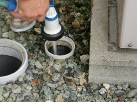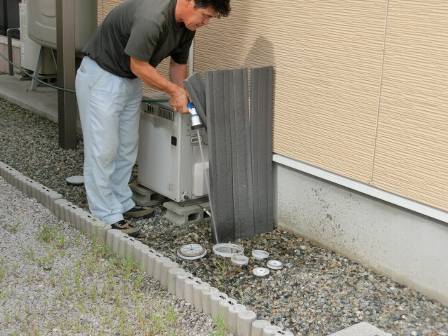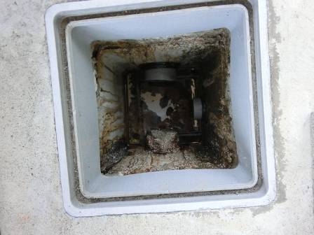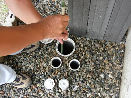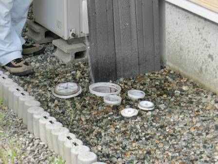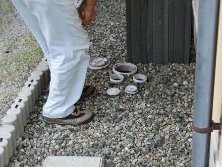 【点検枡】2014年8月11日(月)お家の点検10年目(富山市Y邸) 2015.03.07 [雨水枡] 雨水枡の点検を実施。特に異常はありません。 [建物右面/北西側] [建物前面/北側] [汚水枡] 点検を実施。白い油脂等が少し溜まっていました。 [建物右面/西側/浴室] お客様からホースをお借りして汚水枡内を洗浄しようとしましたが、ホースの長さが少し足りなかったので、少し離れた距離から汚水枡を狙い撃ちしました。ホースの水流で洗浄しながら枡底にこびりついている油脂等に対して棒を使って取り除いています。 お客様にも作業風景を見て頂き、実際にお客様の手でお手入れをお願いしました。 [洗浄前] [洗浄後]