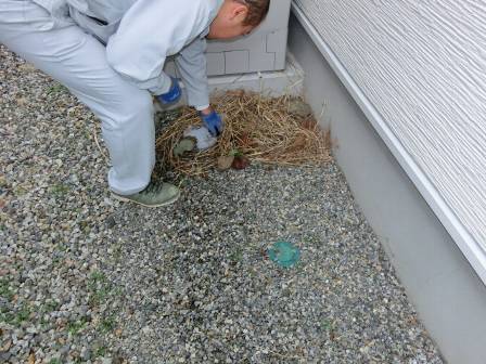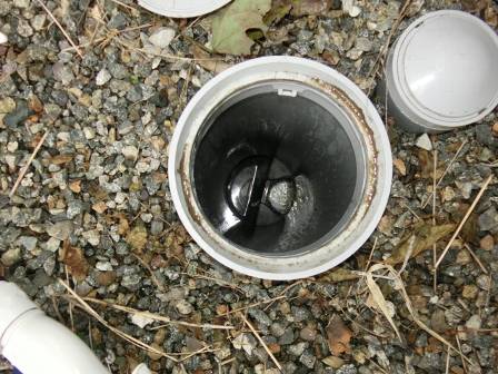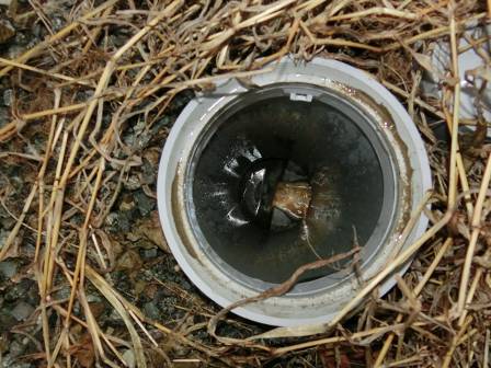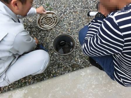 お客様にも見て頂いて雨水枡の仕組みを紹介。雨樋から流れてくる泥や落葉があるので、詰まり防止の為に定期的にカバーを開けてお掃除して頂くようお願いしました。