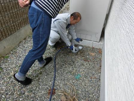 お客様にも内部を見て頂き、油脂等が溜まる原因を説明。お客様からホースをお借りして洗浄しました。