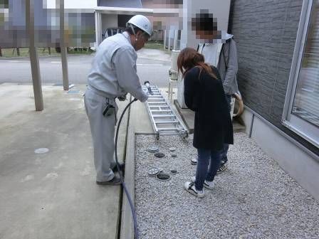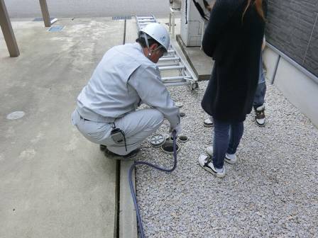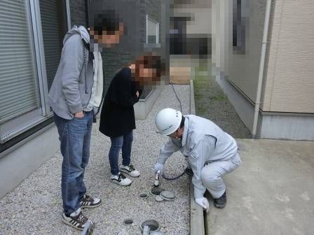 汚水枡の点検を実施。汚水枡内に油脂等の溜まりが少し見受けられたので、お客様からホースをお借りして薬剤を使わずに内部を洗浄している様子を一緒に見て頂きました。