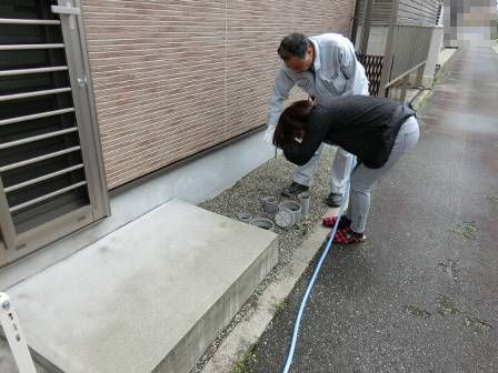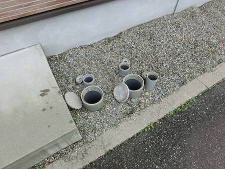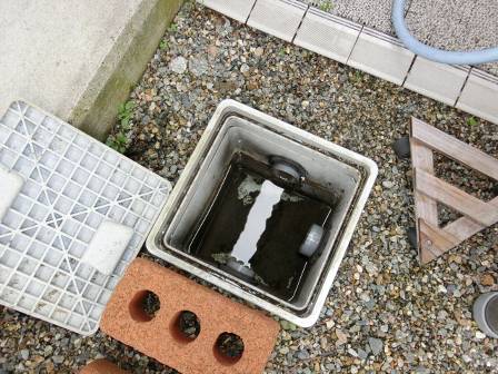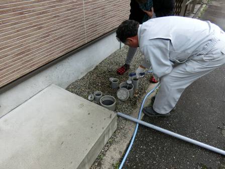 【点検枡】2015年4月21日(火)お家の点検5年目(富山市O邸) 2016.02.18 [雨水枡] 雨水枡の点検を実施。特に異常はありません。 [建物左面/東側] [汚水枡] 汚水枡の点検を実施。汚水枡内に油脂等の溜まりが少し見受けられました。 [建物右面/西側] [浴室] [キッチン] お客様に現状を見て頂き、ホースの水流で洗浄することになりました。 [洗浄後/浴室] [洗浄後/キッチン]