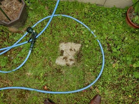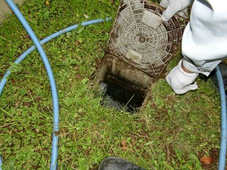 お客様にもお手入れに参加して頂き、配管にこびり付いた油脂等を取り除く為に園芸用ポールを奥から持ってこられました。ホースの水流・水圧だけでは落ちにくいのでポールを併用して擦って落とします。