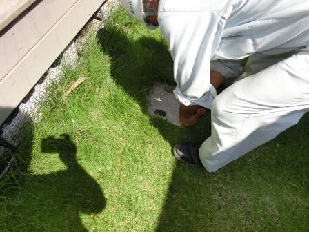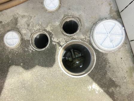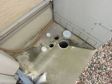 【点検枡】2015年7月15日(水)お家の点検10年目(富山市T邸) 2016.02.19 [雨水枡] 雨水枡の点検を実施。特に異常はありません。 [建物右面/東側] [汚水枡] 汚水枡の点検を実施。白い油脂等が多く溜まっている状態でした。 [建物右面/東側/洗面脱衣室] お客様にも現状を見て頂き、点検スタッフがお手入れとして行なっているホースの水流での洗浄を排水管の「詰まり防止」のために定期的に実施して頂くようお願いしました。 [建物右面/東側/キッチン] トラップ枡の通気管(気圧の状態を調整)を洗浄。配管内に溜まっている油脂等が流れています。 [洗浄中]