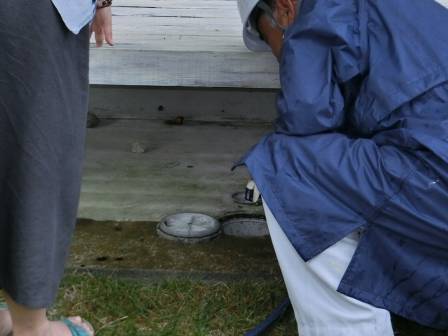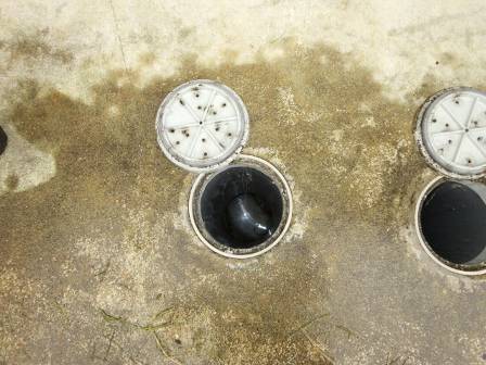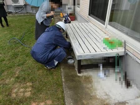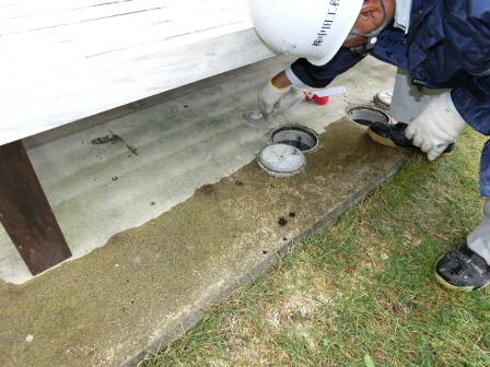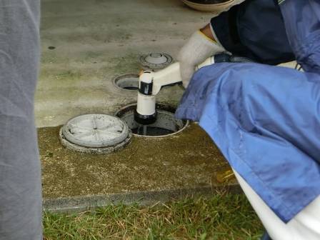 【点検枡】2016年11月1日(火)お家の点検5年目(富山市婦中町N邸) 2017.03.04 [汚水枡] 汚水枡の検査。点検枡や通気管の蓋には複数の穴が開けられています。これは以前に「排水の流れが悪い」という申し出があり、排水時にエアが抜けるよう排水の流れを助ける目的がありました。 [建物後面/東側/トイレ以外の排水] [建物後面/東側/通気管] [建物後面/東側/点検枡] お客様へ日常の生活排水に含まれる油脂等が配管の内壁に少しずつ溜まってくる現象を紹介。将来的な配管の詰まり防止の為、ホースの水流で定期的に洗浄して頂くようお願いしました。