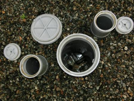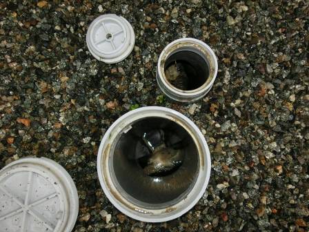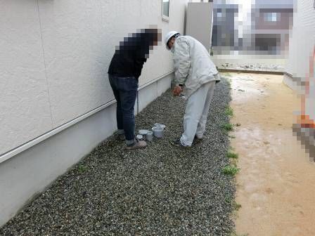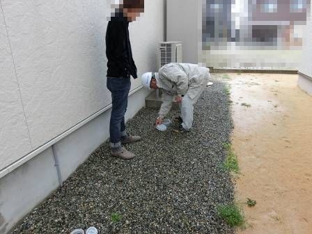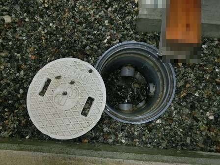 雨水枡の検査では特に異常はありませんでした。本日は雨天だったので雨樋から流れてくる雨水が雨水