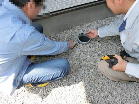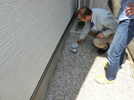 お客様がお家の排水経路に関心があったので、まずはお家の周囲にある雨水枡を紹介。雨樋を流れる雨水が雨水枡に入って・中継して側溝に流れていることを紹介。