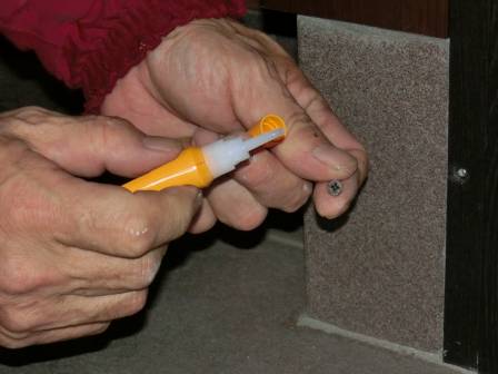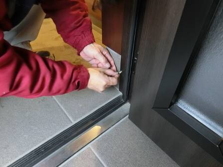 【玄関ドアのビス浮き】2013年12月21日(土)お家の点検2年目(中新川郡立山町S邸) 2014.02.28 Q 先日、玄関掃除をしていたらビスが抜けているのを発見した。 A 現状を確認。ビスの入る下地がコンクリートだったせいか、差していたビスが何かの衝撃で抜けたものと思われます。今回のように「ビス抜け」の場合であっても構造上はほとんど問題ありませんが、入るべき穴にビスが入らず開いているのも見かけが悪いので、改めてビスを打ち込むことにしました。 ビスの周りに紙を巻いて入れてみましたが抜け落ちる状態。 そこで接着剤を使って抜け落ちないようにしました。