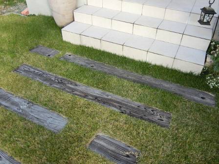 玄関前の芝植えと枕木などはお客様DIYで施工されたご様子。