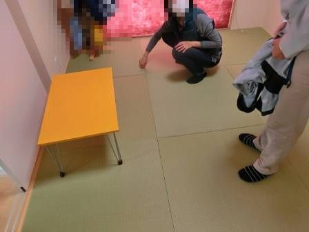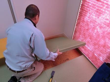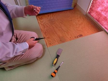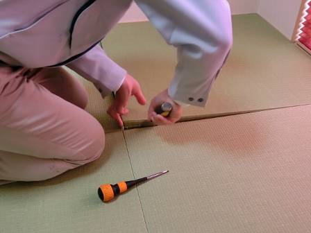 【畳の間からヒモが出ている】2013年11月22日(金)お家の点検1年目(富山市婦中町M邸) 2014.02.27 Q 畳同士の間からヒモが出ている。掃除機で掃除していると、いつも気になる。何とかして欲しい。 A 現状を確認。畳を取り出さないとヒモは取れないようだったので・・・ [和室] ヘラを使って畳を外しています。 ヒモが出ている箇所をハサミで切り取りました。これで大丈夫♪