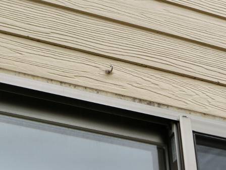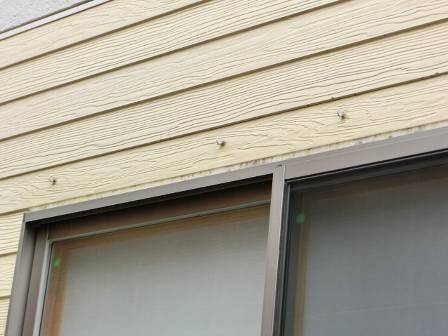 【簾掛け用フック】2016年10月18日(火)お家の点検10年目(富山市S邸) 2017.03.04 お客様宅の外壁にはお客様DIYで簾を掛ける用に複数の引っ掛けビスが打ち込んであります。当時は外壁に穴を開けるのに大変苦労されたご様子。2年目点検後のフォローではお客様サービスの一環として雨水の進入を防ぐ目的でビス穴の周囲にシーリング処理した経緯があります。 [建物後面/南側/和室]