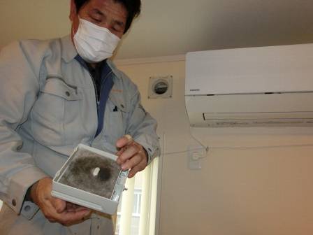 【給気口の掃除】2014年11月8日(土)お家の点検2年目(高岡市O邸) 2015.06.03 室内にある給気口のカバーを取り外し。内側にはフィルターが取り付けられており、取り外しが可能となっている仕組みを紹介。定期的に掃除機でホコリを吸い取って掃除して頂くようお願いしました。 [LDK] お客様へ取り外したフィルターを掃除機でホコリを吸い取っている様子。