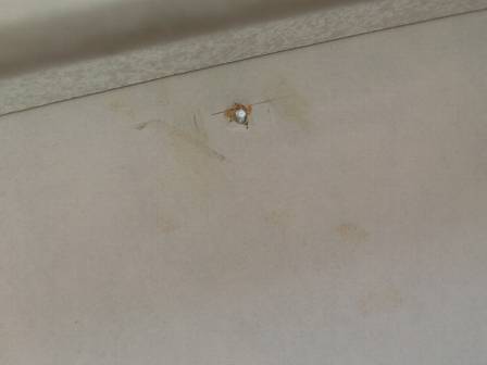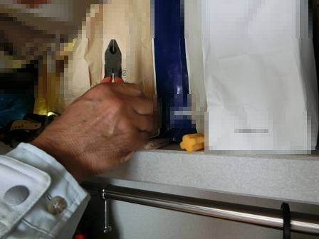 【衣類掛けパイプの支柱のはずれ】2016年10月18日(火)お家の点検10年目(富山市I邸) 2016.12.27 Q 服を吊り下げ過ぎたせいか、パイプの中央にある支柱が外れた。今は服の数を減らしている。 A 現状を確認。3箇所ある支柱の中心部分が棚板から外れている状態でした。手持ちの工具で補修を試みましたが、手直しできなかったので、後日対処になりました。 [2階居室] [棚板の下] [棚板の上]