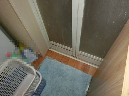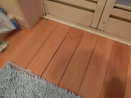 【足拭きマットと木製フローリング】2015年6月19日(火)お家の点検10年目(富山市婦中町T邸) 2016.02.19 洗面脱衣室の床は木製フローリング仕様。足拭きマットをずらして床面を見ると、5年目点検でも確認したのですが、床材同士の間が黒く変色していました。そこで、床材と足拭きマットの間にスノコ等を挟んで通気を確保すること、使わない時間帯は立て掛けて干して頂くよう改めてお願いしました。 [洗面脱衣室]