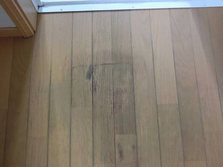 風呂上りの足拭きマットを湿ったまま床の上に置いていたそうで、床材が湿気を吸収して変色したものと思われます。お客様はこの現象に気づかれた後は使う時だけ足拭きマットを置いているとのことです。