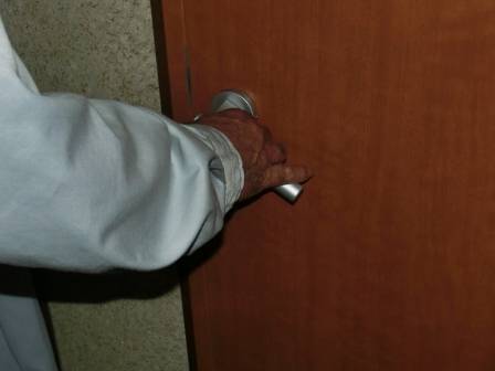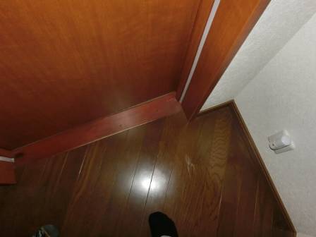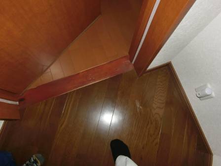 【開き戸が完全に閉まらない】2015年3月18日(水)お家の点検5年目(高岡市A邸) 2016.02.18 Q 開き戸が完全に閉まらない(案内葉書) [渡り廊下/母屋への入口] A 現状を確認。扉が少し下がることでラッチがラッチ受け(ストライクボックス)に入らない状態でした。扉の付け根にある上下・高さを動かせる丁番を回すことで現状を改善。