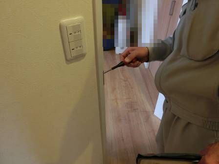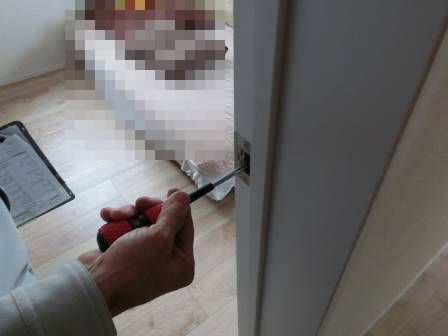 【開き戸のガタツキ】2014年3月19日(水)お家の点検2年目(富山市I邸) 2014.04.04 開き戸の開閉テストを実施。閉めた状態で扉が前後に少し動くようでした。ラッチがラッチ受けに シッカリと収まるようにドライバーで受け金物を補正。 [リビング] [2階居室]