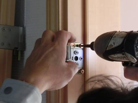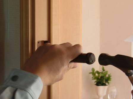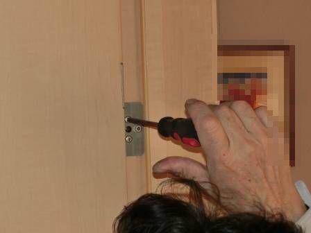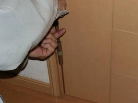 扉の傾きを補正する時、扉の水平さを保つ為に片手で扉を持ち上げながら、もう一方でドライバーを回す必要があります。今回の扉はガラスが入って重いので、中谷が戸先を持ち上げてフォローしています。