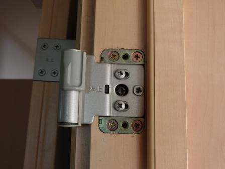 まずは下の丁番のカバーを外して上下に扉の高さを調整できるネジ回し。次に扉の奥行き(前後・左右)を変更できる上の丁番にある固定ビスを補正。
