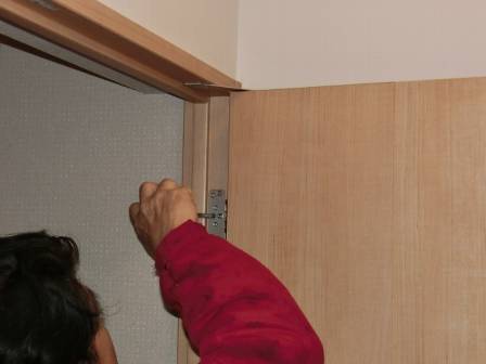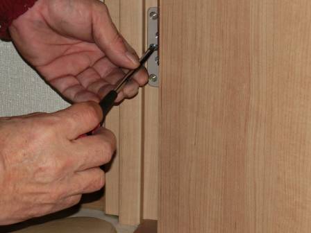 A 現状を確認。ラッチ受けと丁番をドライバーで補正します。