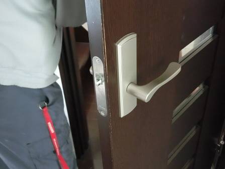 【開き戸の調整方法】2014年5月17日(土)お家の点検5年目(滑川市O邸) 2014.06.19 Q 以前、扉が横(ラッチ側)に出すぎて閉まらないことがあったが、今は支障なく閉まる。でも、閉めた時に扉が前後に少し動く状態であり、直す方法を教えて欲しい。 A 現状を確認。ラッチ受けの金具を微調整しても現象は改善できませんでした。 [LDK] そこで丁番で扉を補正する方法になるのですが、この丁番の固定ネジを緩めるには専用の六角レンチが必要となっています。後日、専門スタッフに対応依頼することをお約束。