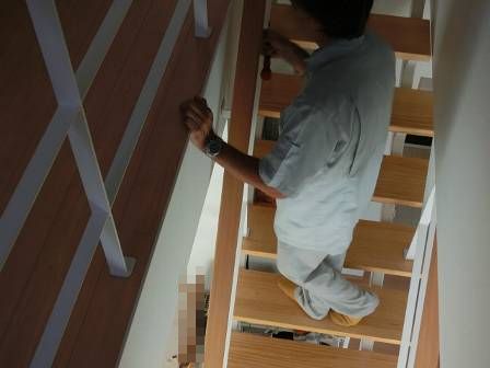 【階段手すりのビス緩み】2014年7月1日(火)お家の点検1年目(富山市I邸) 2015.03.06 階段手すりの固定具合を確認。少し揺れる状態でした。 [LDK] 手すりのぐらつく原因を調査するとビスの緩みを発見。下地材が無い場所にビス打ちされており、ビスが抜けて効かなくなっている状態でした。お引渡し以降、約1年の歳月の経過で少しずつ緩んできたものと思われます。後日、長いビス2本に取り替えて対処することをお約束。 このような事例もありますので、1年目点検ではシッカリと見させて頂いております。
