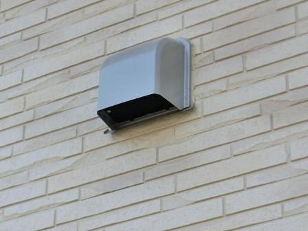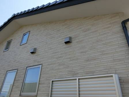 【雨垂れ確認】2014年3月29日(土)お家の点検2年目(富山市H邸) 2014.05.28 雨垂れはほとんど見受けられませんでした。外壁は光触媒仕様になっています。 [建物後面/西側] [建物右面/北側] ベンドキャップの仕様。外壁との間には斜めに金物が入っています。これが雨垂れを外壁に付かないようにする役割・工夫があると思われます。