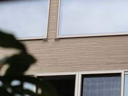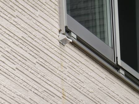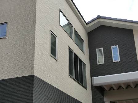 外壁は窯業系のサイディング仕様。外壁の色・模様からみて雨垂れが目立ちそうな感じですが、新築から5年経過した今でも特に黒い雨垂れは全体的にはそれほど見受けられません。サッシの両サイドの真下に取り付けられている雨垂れ除け水切りが効果を発揮しているというところでしょうか。