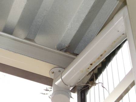 【鳥の巣】2016年6月30日(木)お家の点検5年目(富山市K邸) 2016.12.27 Q 鳥がカーポートに巣を作っている。 A 現状を確認。カーポートの雨樋・集水器の入口周囲に鳥の巣がありました。脚立を足場にして巣を取り除こうとしたのですが、ちょうどその時に親鳥が飛んできて、ひな鳥が鳴いているのを見聞きすると、少しかわいそうに感じました。お客様と協議の結果、「ひな鳥が巣立った後に取り除く」こととなりました。 [建物北側/カーポート]