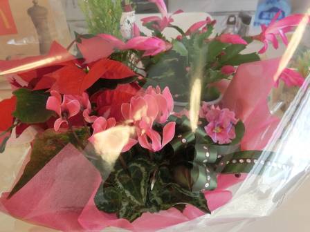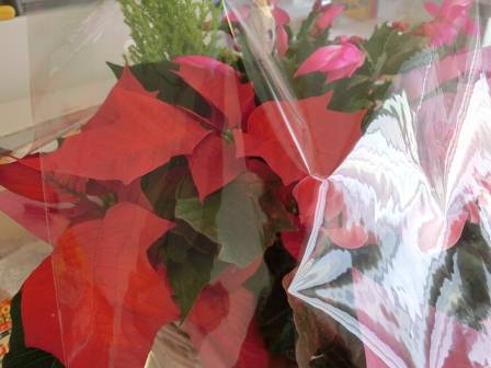季節の花が活けられているセンスが良い鉢花。今回は真っ赤なポインセチアがクリスマス色を演出。
