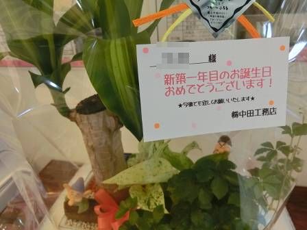 新築にお引越しされて1年目のご挨拶。今回も昨日のNさま邸1年目点検に引き続き、持ちの良い観葉植物系となっています。