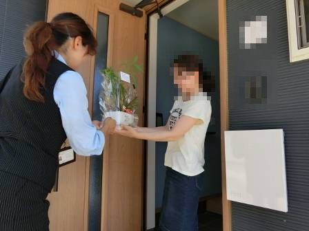 【1年目のお誕生日】2014年7月1日(火)お家の点検1年目(富山市I邸) 2015.03.06 新築にお引越しされて1年目のご挨拶。玄関ドアがバタンと開くと同時にお客様にも笑みがこぼれます。 営業の中谷からお家のお誕生日プレゼントを贈呈。お家の緑化に貢献してるのかも・・?