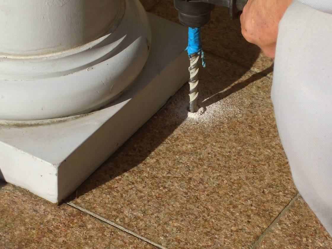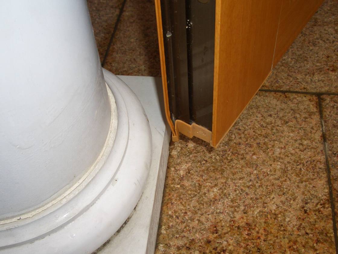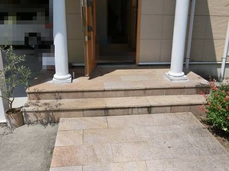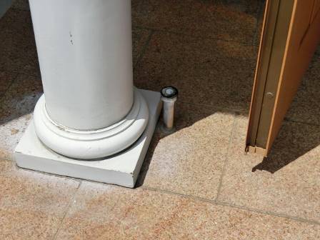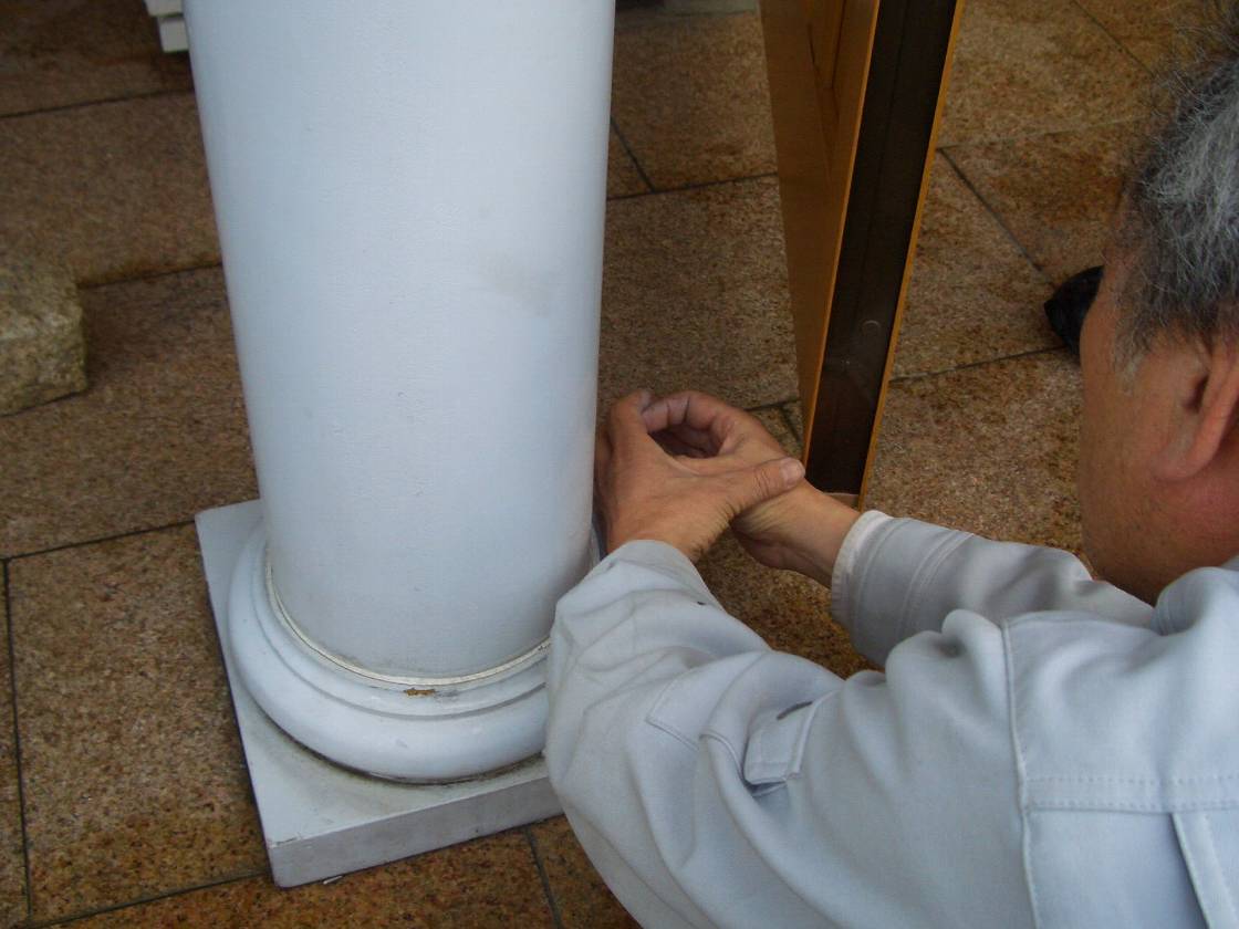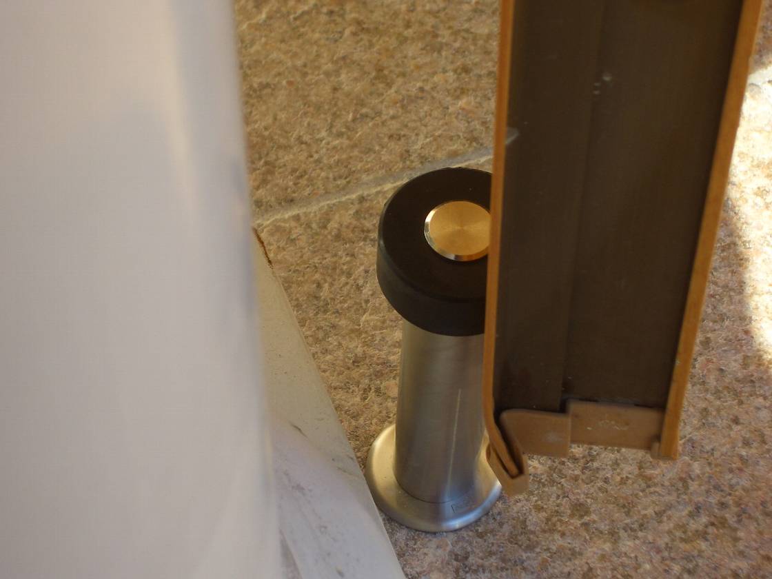 【5年前、ドアストッパーを取り付けしていました】2014年5月16日(金)お家の点検10年目(富山市M邸) 2014.06.18 これは今回の10年目点検での様子です。ポーチ柱の横にドアストッパーがあります。 今から約5年前の5年目点検でのこと。玄関ドアにストッパーを取り付けるまでの流れです。 当時は玄関ドアを開けすぎるとポーチ柱にぶつかってしまい、扉が少し凹んだ状態でした。事前にどんなイメージで取り付けるのか?寸法はどれくらいか?お客様に説明している様子。 作業順序では・・・ こうやってタイルにドリルで穴を開けてストッパーを差し込む作業となります。当時が懐かしく感じられます。
