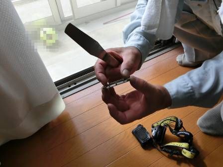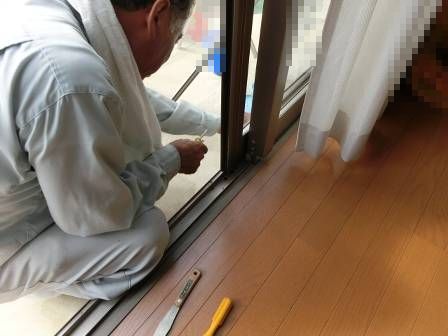 お客様から「網戸の開閉が効きにくい」との申し出があったので、網戸のレール周辺を検査しています。すると、何が原因か分かりませんが、サッシのレール部分にはめ込んである部材が取れて網戸のレールに引っ掛かっていました。