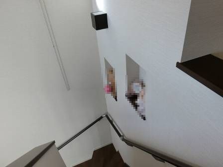 飾り棚が上手に配置、壁スペースが有効に使われています。「壁に貼る」のではなく、「壁を飾る」という発想だと思われます。