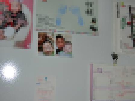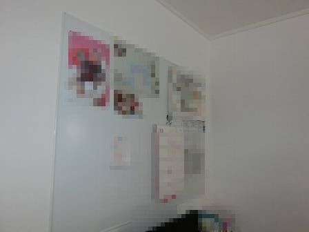 また、別の場所の壁にはホワイトボードが吊り下げられています。ボードにはペタペタとセロハンテープを使って好みに合わせた思い出が飾り貼られています。
