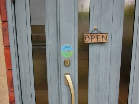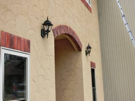 お店の入口はアーチ状にブリックタイルが貼られている施工です。その周囲にはアイアン製の外灯が灯るオシャレなアンティークさを演出。塗り壁調の外壁には10年の歳月という経年変化等が現れていますが、手作り・工芸品のような味わいが今なお感じさせてくれます。