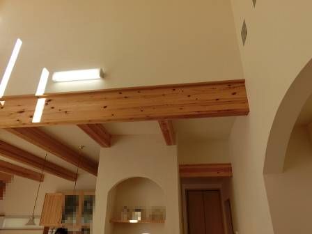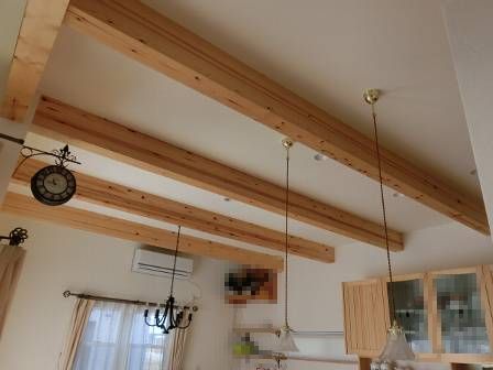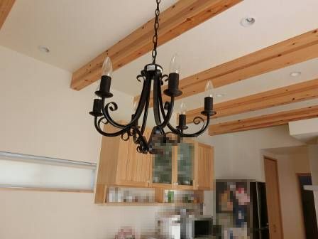 天井の梁を見せた・魅せた室内空間とアイアン(鉄製)の照明器具やカーテンレール、手摺り等々。吊り下げ型(ペンダント)ライトやシャンデリア風など。シーリング型とは違ったオシャレな趣きがあります。