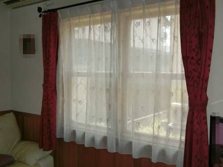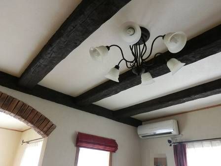 天井に配してあるのはアンティークビーム(擬木)という古びた木材に似せた部材です。本物の古木ではないのですが、シッカリと風情が感じられる一品ですし、オシャレな店舗にも数多く採用されています。木製サッシが薄っすらと見える窓、アイアン製のカーテンレール、そして腰壁仕様等々。10年経った今でも新築当時の美しさが今なお保たれていますし、それ以上かもしれません。