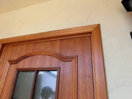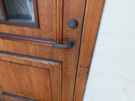 定期的に欠かさず防水塗装されている無垢の玄関ドア。ドアの外側は内側に比べると少し色あせてはいますが、重厚感のある自然な感じを好まれるお客様にとっては是非とも新築のお家に取り入れたいアイテムのひとつですよね。
