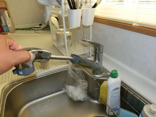 [シンク下にある白い容器は蛇腹ホースの根元から水が浸入した場合の受け皿になっている仕組みを紹介]
