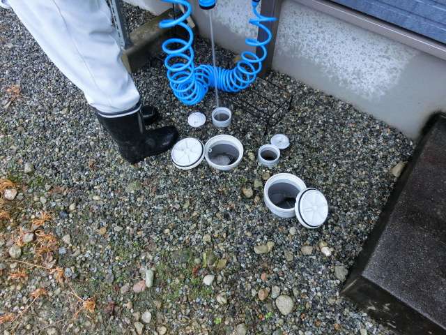 油脂等の溜まりが見受けられたため水道をお借りして通気菅や点検枡の油脂を洗浄。