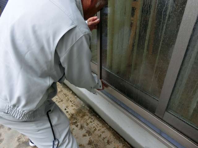 いったん網戸を取り外して台車の状態を確認。改めて網戸を取り付け直すと動きが改善(レールと台車がかみ合っていなかった)