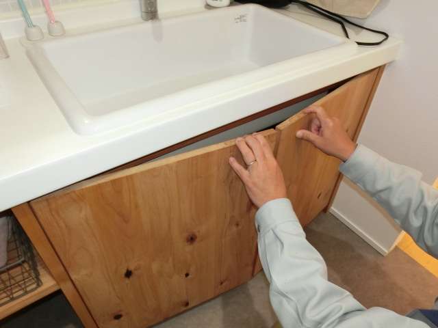 給排水管からの水漏れの有無を確認。収納の陰になることで給排水管からの水漏れは発見しにくい為、「水漏れ事例」を知ること、確認する習慣を促した。