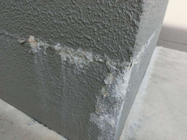 現状を確認。基礎周りの内側にある土間コンクリート内の水酸化カルシウムが溶け出して空気中の二酸化炭素に反応し炭酸カルシウムになる現象。手でポロリと剥がれる状態になっていた為、該当する2面を改めて施工することとなった。