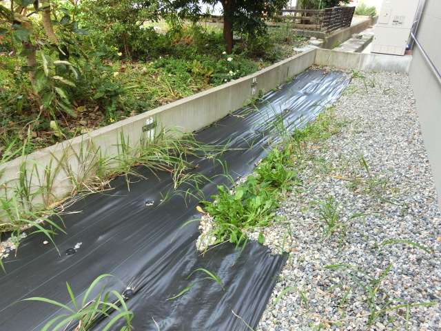 防草シートが敷いてあっても外構の草刈りが大変。お客様と協議。「砂利を敷く」、「土間コンクリートを打つ」選択肢を口頭で提案。