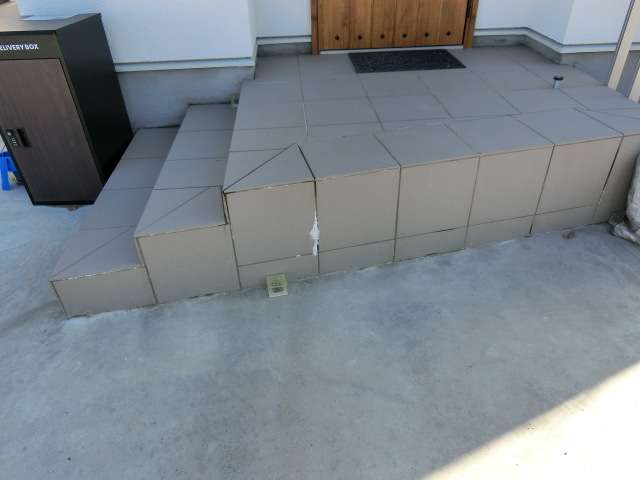 玄関タイルの目地から土間コンクリート内の水酸化カルシウムが溶け出して空気中の二酸化炭素に反応し炭酸カルシウムになる白華現象を確認。今回は記録となった。