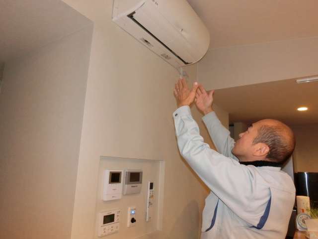 現状を確認。エアコンから水が漏れる原因にはドレンホースの詰まり等がある。対処することとなった。