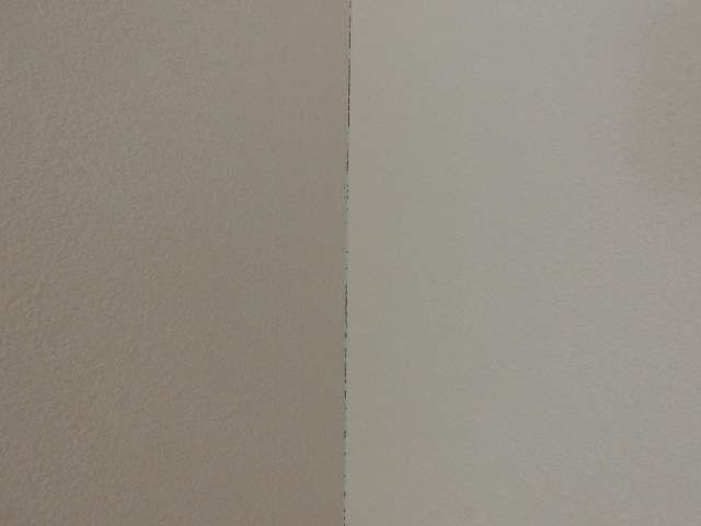 現状を確認、天候や室内の湿度環境等によっ木部が伸縮、ボードの動き、クロスの追随等の一連の流れによって起こり得る現象となる。今回はコークボンドを忘れた為、点検が終わった後に取りに戻ってコークボンドを充填することとなった。