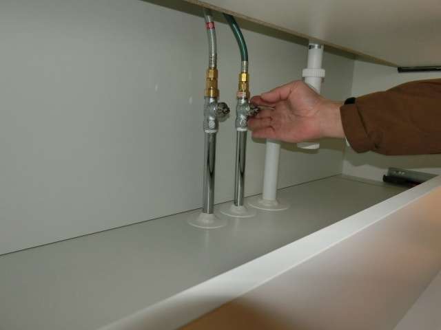 シンク下にある白い容器が定位置ではなかった為、蛇腹ホースの真下に移動させた。