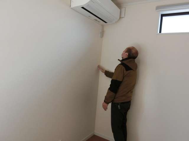 現状を確認、天候や室内の湿度環境等によっ木部が伸縮、ボードの動き、クロスの追随等の一連の流れによって起こり得る現象となる。今回はコークボンドを忘れた為、点検が終わった後に取りに戻ってコークボンドを充填することとなった。